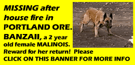Banzaii is a 2 year old Malinois, light fawn. Sort of a racy build. Accidently let loose by firefighters. She was seen by neighbors running scared in the neighborhood but she was too afraid to come to them. Otherwise she is highly trained.