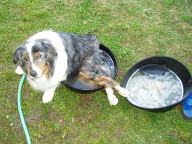If you use a diaper or just a belly band, or if your dog is dragging around nekkid, you will have to be concerned with urine on your dog's skin. On males, keeping the area around the penis and inside the hind legs shaved down prevents hair from holding urine and it can help prevent UTIs (Urinary Tract Infections). I wipe under him with baby wipes a couple times a day and any time I express him. I use cornstarch in a powdered sugar shaker as a baby powder, the shakers are available at a restaurant supply store. When I go to put a belly band on him, I smear Bag Balm on the shaved areas, it's available at many drug or feed stores. Do NOT ever use a baby ointment with zinc on dogs. Copper's thick fur on his hind legs helps pad him and has protected him from abrasion as he drags around. So I won't cut any of it off, but he now needs more grooming than ever before. I rake him throughly every day or two. He sometimes drags through his own poop, and he's a mud hound anyway, so he can be a real mess. One thing I found really helps is Show Sheen, a silicone grooming spray for horses. It's non-toxic and safe for topical use on dogs. I spray the top coat of his haunches and hind legs with it, I don't need to get down to the skin, but I comb it well through the guard hairs. I use a blow dryer to dry it quickly. It really helps prevent anything from sticking to his fur and as a bonus it gives him a nice shine.