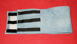 Myself, I'm a pretty sloppy seamstress. His around-the-house belly bands aren't nearly as nice, but they work. Fortunately he still has some control and I usually only need to use them at night. I zigzagged the hems and just folded them over once since my machine is an old cheapie and wouldn't like the thickness in the corners.. I get a little unravelling after every wash, but it's not too bad. An old pair of jeans makes 4 bands and I used scrap velcro that I've gathered over the years. Marking the center with a line of zig zag makes it easier for me to center the pads quickly.